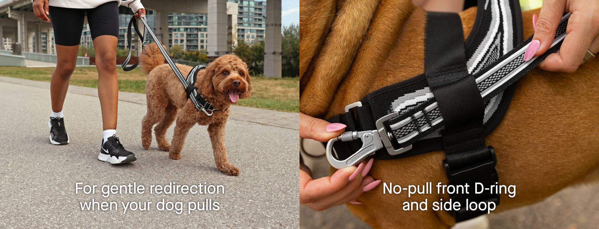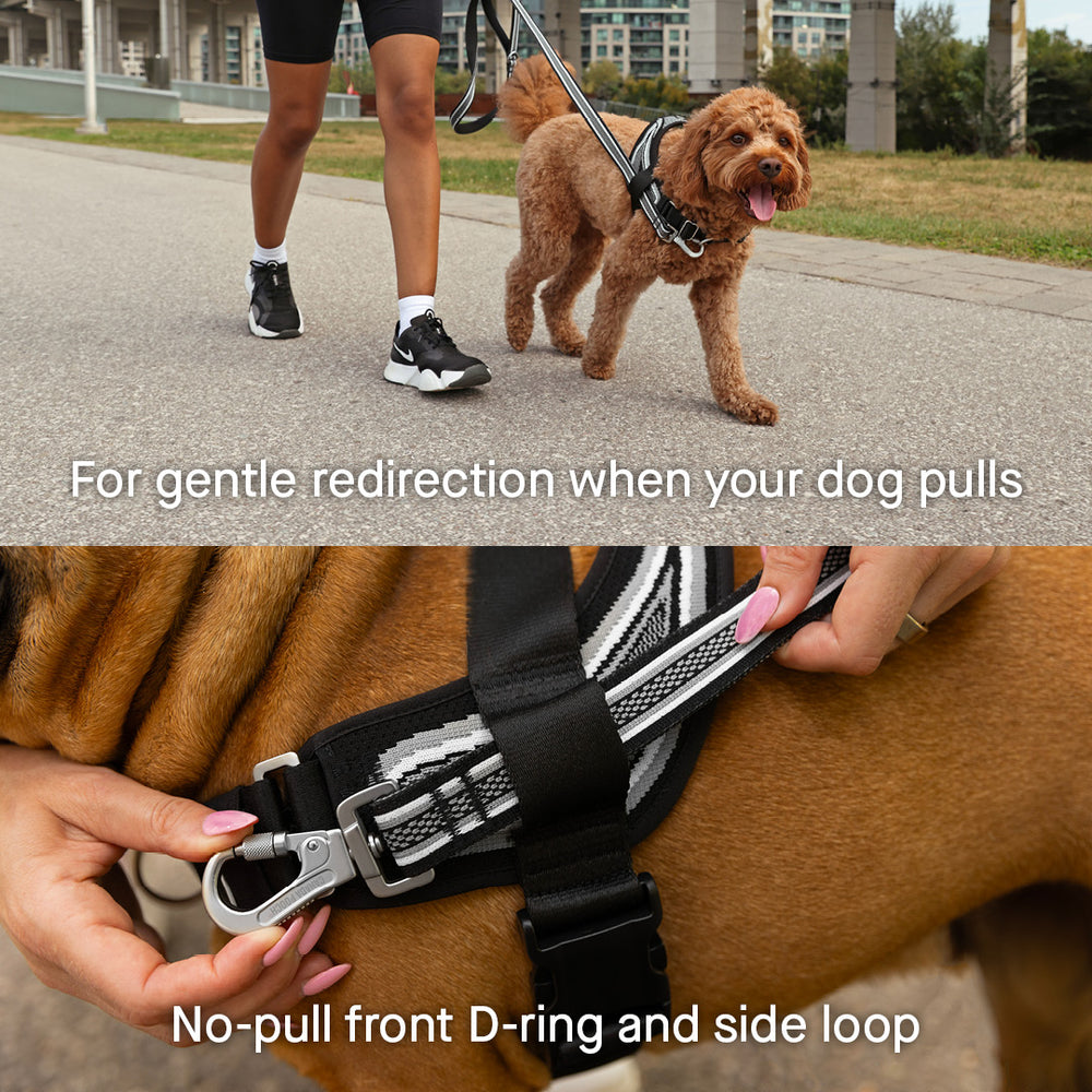 - For gentle redirection on walks, feed the leash through the side loop of the harness before attaching it to the front D-ring